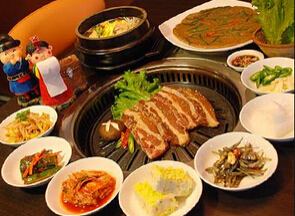 韩国烤肉,韩国料理中一道大菜。韩国烤肉主要以牛肉为主,牛里脊、牛排、牛舌、牛腰,还有海鲜、生鱼片等都是韩国烧烤的美味,尤以烤牛里脊和烤牛排最有名,其肉质的鲜美爽嫩。韩国烤肉吃法有别于中式烤肉和巴西烤肉,其吃法很特别,吃肉的时候要包着生菜叶或苏子叶吃。通常是在手里摊开生菜叶,也可以重叠地铺上苏子叶,夹一块烤肉,夹一点辣椒,抹一点酱,也可以随意地放上泡菜米饭,最后收拢菜叶,裹成一团即可食用,生菜叶或苏子叶的清爽、烤肉和着辣酱等作料的浓香,使人们享受美食带来的快感。