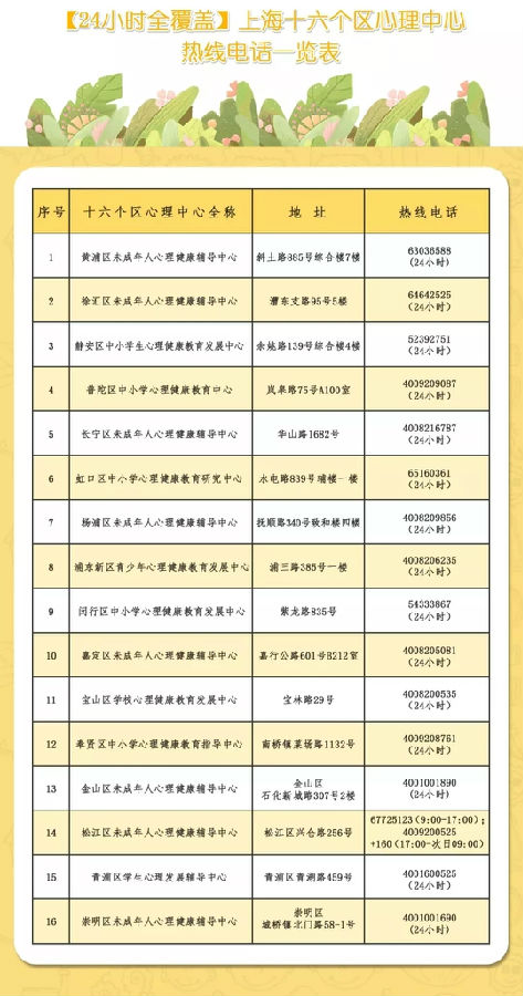 上海16个区24小时心理热线电话