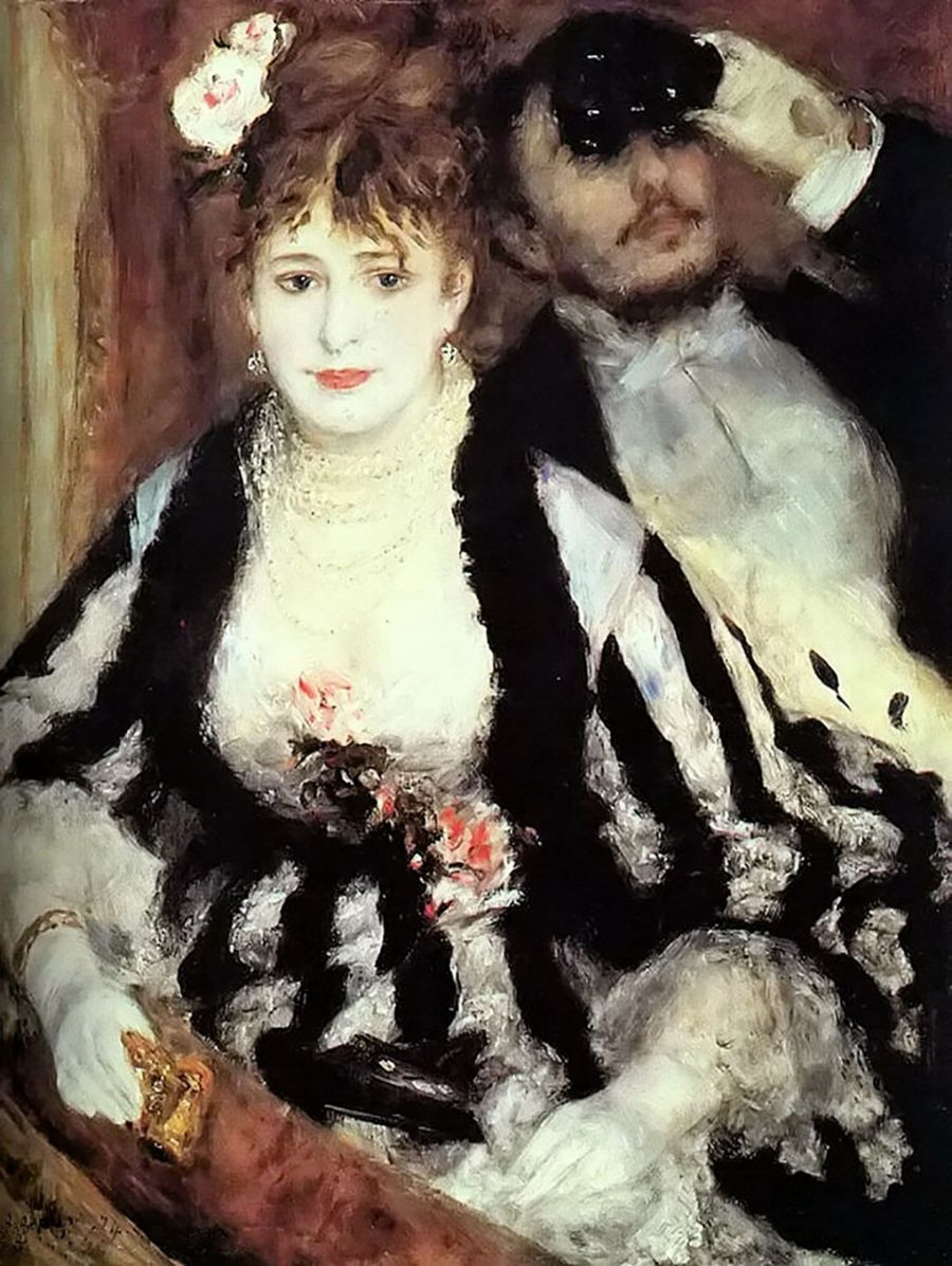 《包厢》(The Theater Box)则是雷诺阿正式参加印象派美展的第一次参展作品之一。他一共送去七幅油画。这幅画根据他在剧院里所得的“印象”,回到画室里请人摆模特儿画成的。画上前面那个盛装贵妇是一名叫尼尼·洛比丝的模特儿扮成的。后面手拿望远镜的中年绅士形象,则是由雷诺阿的一个兄弟充当模特儿的。