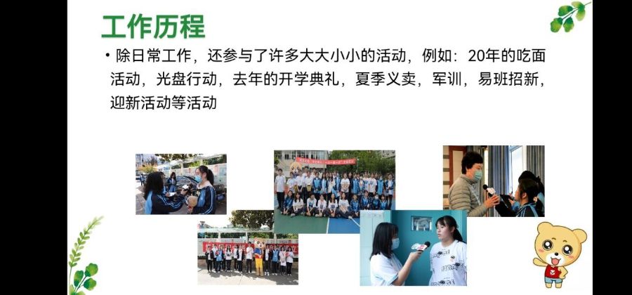 竞选由外联部成员主持,在介绍完流程和发言顺序后,线上竞选大会正式开始,候选人按顺序依次发言。伴随着PPT一页一页的划动,同学们进行自我介绍
