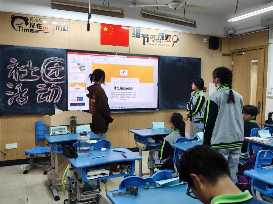 刘悦同学通过“什么是亚运会”“有什么意义”“体现了什么精神”等问题带大家了解了这富有科技感的亚运会,同时精彩的活动也深受同学们喜爱。